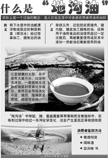 研究表明,長期攝入地溝油會對人體造成明顯傷害,如發育障礙、易患腸炎,并有肝、心和腎腫大以及脂肪肝等病變。而地溝油中的主要危害物之一黃曲霉素是一種強烈的致癌物質,其毒性是砒霜的100倍。另一個問題是倫理上的,別人吃過的油,在下水道里變質,再撈上來,你能吃得下去嗎? 那么,有沒有一種簡便的方法,可以鑒別地溝油呢?我們不妨聽聽食品科學專家和業內人士怎么說。 1、科學鑒別地溝油 目前沒有好辦法 在一個注重食品安全的時代,理想的狀態是,你下館子,隨手掏出一張試紙浸到菜里,過一會兒拿出來跟譜表比比,然后大叫:“掌柜的,換油!” 2、傳統的檢測方法 都有一定局限性 在科研工作者看來,治理地溝油的難點在于,經過洗滌、蒸餾、脫色、脫臭等精煉過程后,單從外觀和感官上,很難區分地溝油和普通油。不法商販還會把地溝油摻入食用油中,如果含量較少,更是難以檢測。 3、鑒別地溝油 冰箱顯身手? 曾在北京多家大酒樓擔任總廚、高管的特級廚師馮鵬說,一般情況下,地溝油和普通油無法區分,進貨時難免上當。他只能通過實踐來判斷:飯館炒菜之前一般要先過油,在這道“滑油”工序中,好油可反復使用七八次,而地溝油最多使用三次就會變黏,而且有哈喇味兒。 “另外,室外溫度較低時,地溝油會像棕櫚油一樣凝固,所以常有人用地溝油冒充棕櫚油。”馮鵬說,冬天可以據此鑒別地溝油,夏天則可通過冰箱來檢驗。一些媒體認為地溝油有味道,可以聞出來,此外里面含水多,下鍋會爆響,馮鵬認為這些都是無稽之談,因為水根本摻不進油中,且地溝油也沒什么異味。 4、我們該如何 鑒別地溝油? 一看。看透明度,純凈的植物油呈透明狀,在生產過程中由于混入了堿脂、蠟質、雜質等物,透明度會下降;看色澤,純凈的油為無色,在生產過程中由于油料中的色素溶于油中,油才會帶色;看沉淀物,其主要成分是雜質。 二聞。每種油都有各自獨特的氣味。可以在手掌上滴一兩滴油,雙手合攏摩擦,發熱時仔細聞其氣味。有異味的油,說明質量有問題,有臭味的很可能就是地溝油;若有礦物油的氣味更不能買。 三嘗。用筷子取一滴油,仔細品嘗其味道。口感帶酸味的油是不合格產品,有焦苦味的油已發生酸敗,有異味的油可能是地溝油。 四聽。取油層底部的油一兩滴,涂在易燃的紙片上,點燃并聽其響聲。燃燒正常無響聲的是合格產品;燃燒不正常且發出“吱吱”聲音的,水分超標,是不合格產品;燃燒時發出“噼啪”爆炸聲,表明油的含水量嚴重超標,而且有可能是摻假產品,絕對不能購買。 五問。問商家的進貨渠道,必要時索要進貨發票或查看當地食品衛生監督部門抽樣檢測報告。 |